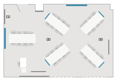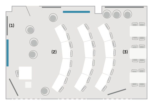 Die Ausstattung der Modellräume mit Mobiliar und Technik unterstützt studierendenzentrierte und hybride Lehr- und Lernsettings durch vier konzeptionelle Modi. Mehr dazu finden Sie unter dem Punkt Didaktik.