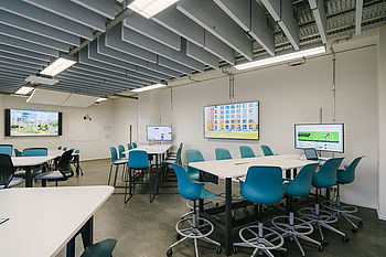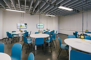 Zwei Modellräume sind als Active Learning Environments mit immobilen Gruppenarbeitsbereichen ausgestattet. Über die Zuordnung von digitalen und analogen Visualisierungsmedien an den Gruppenarbeitstischen werden vielfältige Interaktionsmöglichkeiten ermöglicht.